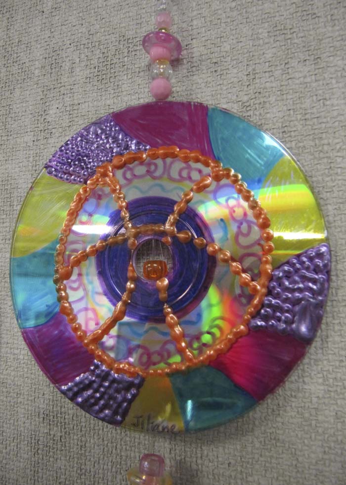 My 6th, 7th and 8th grade students created mandalas using recycled CDs, sharpie and 3-D fabric paint. On one side of the CD, students created symbols for the three qualities they'd most like to have such as strength, peacefulness, happiness. On the other side of the CD, they put down one wish or hope they have for the world. The reflective nature of the CD is used by the students to project their hopes and wishes into the world. This mandala project was chosen to be part of the 2nd Annual Arts Splash at Villa Montalvo in Saratoga, Ca.